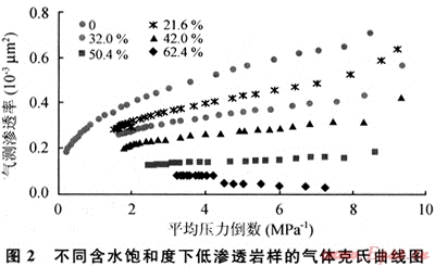 然而,低滲透巖樣氣體滲流受含水飽和度影響的同時(shí)也受到壓力、流速乃至界面阻力的作用。圖2表明,當(dāng)含水飽和度(Sw)小于50%時(shí),氣體滲流遵循其本身的非線性滲流特征,即存在慣性效應(yīng)和滑脫效應(yīng)的共同作用,克氏曲線形態(tài)與干燥巖心的克氏曲線形態(tài)一致。當(dāng)含水飽和度較高(Sw≥50%)時(shí),氣體滲透率與平均壓力倒數(shù)的關(guān)系曲線不同于常規(guī)克氏曲線,出現(xiàn)了類似于液體在低滲透儲(chǔ)層中的滲流特性,表觀滲透率隨壓力的增大而增大,此時(shí),巖心中的水所起的主要作用阻滯氣體的流動(dòng),使得氣體滲流出現(xiàn)“閾壓效應(yīng)”的特征。顯然,式(4)無(wú)法描述圖2所示的現(xiàn)象,為此提出低滲透氣藏氣水兩相運(yùn)動(dòng)方程,即