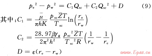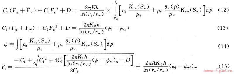 假設(shè)一口氣水兩相流氣井位于均質(zhì)、水平等厚的無(wú)限大地層中,儲(chǔ)層中發(fā)生氣、水兩相等溫滲流,符合非線性滲流方程式(5)、式(6),氣、水彼此互不相溶,忽略重力及毛細(xì)管力的影響。當(dāng)?shù)蜐B透多孔介質(zhì)中的流體遵循非線性滲流方程式(5)、(6)時(shí),氣體在低滲透多孔介質(zhì)中遵循二項(xiàng)式運(yùn)動(dòng)規(guī)律,即式(1),相應(yīng)的產(chǎn)能方程可寫(xiě)為[7]: