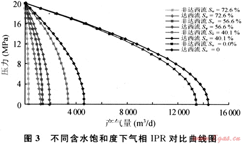計(jì)算結(jié)果表明(圖3):低滲透砂巖儲(chǔ)層隨含水飽和度增加,氣井產(chǎn)能降低嚴(yán)重。當(dāng)含水飽和度為40%時(shí),氣井無(wú)阻流量的損失幅度約為干氣藏的70%,含水飽和度達(dá)到60%時(shí),氣井無(wú)阻流量的損失幅度約為干氣藏的90%??紤]低滲透介質(zhì)非達(dá)西滲流特征的氣體IPR曲線相對(duì)線性達(dá)西滲流特征的氣體IPR曲線小幅收縮,隨含水飽和度增加,由非線性滲流引起的產(chǎn)能損失逐漸減少。當(dāng)生產(chǎn)壓差較小時(shí),二者計(jì)算的氣井產(chǎn)量基本相同。