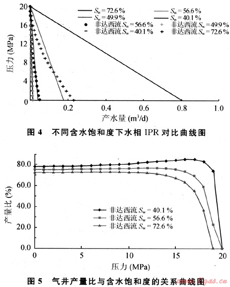 圖4表明該低滲透氣藏氣井產(chǎn)水量非常少,幾乎不產(chǎn)水,含水飽和度高的情況下產(chǎn)水量相對(duì)增加;在考慮非線性滲流因素影響后,隨氣井產(chǎn)量的降低,產(chǎn)水量進(jìn)一步下降。在無(wú)人工改造的情況下,由于低滲透儲(chǔ)層中水滲流界面阻力梯度較大,導(dǎo)致大量水被束縛在孔隙、吼道中,難以動(dòng)用,一方面減小了氣體的滲流通道,另一方面對(duì)氣體形成水鎖圈閉,從而大大增加了氣體開(kāi)發(fā)的難度,降低了氣井產(chǎn)量。