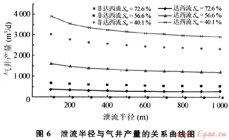 當(dāng)井底流動(dòng)壓力為10MPa、即生產(chǎn)壓差為10MPa時(shí),在同樣的泄流半徑條件下,隨著低滲透儲(chǔ)層含水飽和度的增大,氣井產(chǎn)能逐漸減?。辉谕瑯雍柡投葪l件下,隨泄流半徑的增加,氣井產(chǎn)量下降,氣井產(chǎn)量在泄流半徑小于200m的范圍內(nèi)下降幅度較大,大于200m以后,下降幅度減緩,當(dāng)泄流半徑超過(guò)300m后,氣井產(chǎn)量基本不再受泄流半徑的影響。在理論上低滲透氣井的合理井距應(yīng)布置在600m以內(nèi)為宜(圖6)。