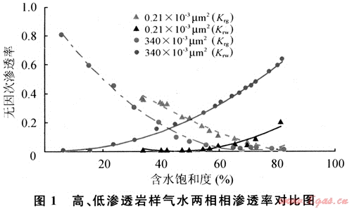 實(shí)驗(yàn)表明,較之于中高滲透巖心而言,低滲透巖樣氣相、水相最大相對(duì)滲透率值較小。氣、水共滲區(qū)域較窄,隨含水飽和度升高,水相相對(duì)滲透率上升緩慢,水相形成連續(xù)流動(dòng),而氣相無(wú)因次滲透率迅速下降接近于0,出現(xiàn)所謂的“水鎖”現(xiàn)象[3](圖1)。Muskat等人[5]建立的兩相滲流運(yùn)動(dòng)方程成立的前提是相對(duì)滲透率僅是含水飽和度的函數(shù),而不受壓力、流速以及界面阻力的影響。即