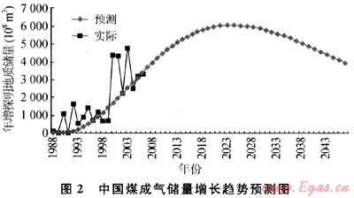 煤成氣儲量增長預測參數(shù)選取:A=4500,C=12,x=3,T0=1988。