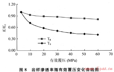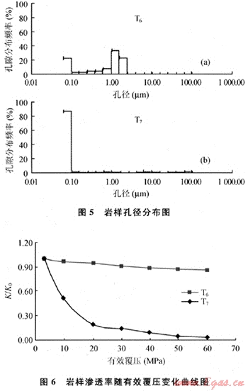 T6(K0’=12.62×10-3μm2,φ0=14.8%)和T7(K0’μm2,φ0=3.7%)是孔滲參數(shù)差=0.079×10-3異較大的兩塊巖樣。從巖樣的孔徑分布圖與覆壓滲透率變化曲線(圖5、6)可以看出:對于低孔低滲透巖樣,小孔徑占了絕大多數(shù),在覆壓實驗中,小孔道一旦受到壓縮發(fā)生塑性變形就會嚴(yán)重喪失滲流功能,導(dǎo)致巖樣的滲透率大幅下降,表現(xiàn)出較強的應(yīng)力敏感性。