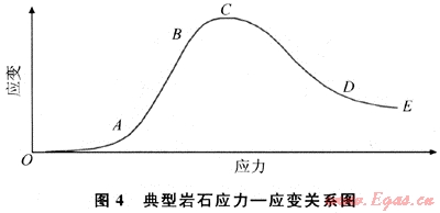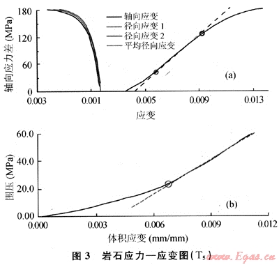 圖3是采用三軸巖石力學(xué)測試系統(tǒng)得到的巖石應(yīng)力-應(yīng)變關(guān)系曲線。從圖3-a可以看出:在應(yīng)力增大的初始階段,巖石發(fā)生的變形較大,有一定軟塑性變形,隨著軸向應(yīng)力增大(超過30MPa),逐漸過渡到穩(wěn)定的彈性變形階段,超過彈性極限后,巖石進(jìn)入塑性變形階段,最終破壞失穩(wěn)。從圖3-b則可以更明顯地看出巖石在圍壓增大的初始階段變形較大,整個變形過程不是線彈性變形過程。