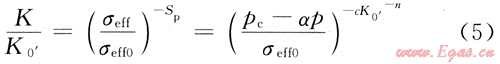 曲線斜率的絕對值,表示應(yīng)力敏感程度;K0’為有效覆壓為σeff0時的滲透率,即巖心初始滲透率(或常規(guī)滲透率),10-3μm2;φ0為巖石常規(guī)孔隙度;K為有效覆壓為σeff(即孔隙壓力為p)時的滲透率,10-3μm2;c、n為擬合系數(shù);pc為實驗中為圍壓,儲層條件時為儲層上覆壓力,MPa;p為孔隙壓力(地層壓力),MPa;α為有效應(yīng)力系數(shù),在低滲透砂巖儲層條件下其取值范圍為0.9~0.98。參考文獻(xiàn)