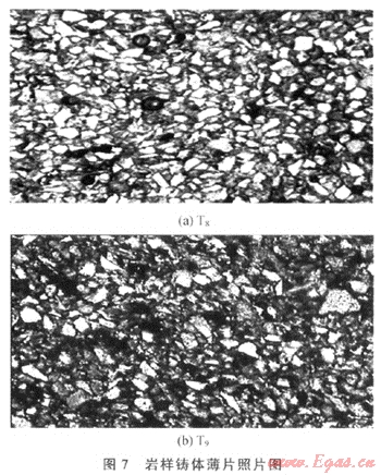 巖石受力過程中,最先發(fā)生變形的是泥質(zhì)和膠結(jié)物,這些物質(zhì)的含量越高,巖石發(fā)生軟塑性變形的程度越大,則巖石在覆壓實驗中滲透率的下降幅度越大。對T8和T9兩塊巖樣進(jìn)行鑄體薄片觀察(圖7),得知T9的填隙物含量和泥質(zhì)含量均高于T8(物性參數(shù)見表1),從圖8可知T9的應(yīng)力敏感性強于T8。對于不同的油氣藏,因成藏過程不同,其巖石成分有較大差異,因而應(yīng)力敏感性也會存在差異。