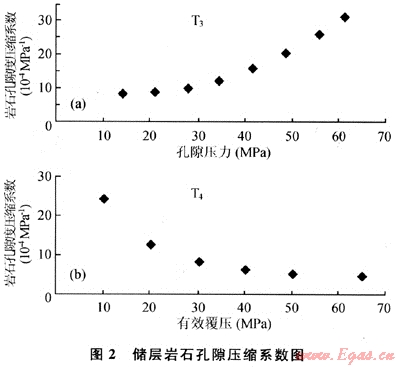 圖2是采用增加圍壓與降低孔隙壓力兩種方法所測得的巖石孔隙壓縮系數(shù)與應(yīng)力的關(guān)系曲線。從圖2中可以看出是變化值而非固定值,初始值很高,隨著圍壓增大、孔隙壓力減小,下降很快,圍壓、孔隙壓力達(dá)到一定值后,變化不大,保持穩(wěn)定,這表明在實驗過程中巖石發(fā)生的并非理想的線彈性變形。