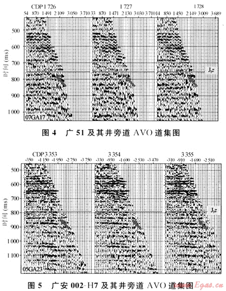圖3是過廣51(工業(yè)氣井)和廣安002-H7(水井)的一條近道和遠(yuǎn)道疊加剖面對比圖,從圖中看出,須六段氣層底的反射在遠(yuǎn)道疊加剖面上的振幅明顯比近道疊加剖面振幅強(qiáng),近道疊加剖面主要表現(xiàn)為中-中弱振幅、較連續(xù),而遠(yuǎn)道振幅較強(qiáng),但橫向上振幅強(qiáng)弱變化明顯,有時(shí)呈低頻、復(fù)波特征;反射軸時(shí)常出現(xiàn)上下起伏、零亂等反射特征。水層在近道疊加剖面和遠(yuǎn)道疊加剖面上反射振幅都較強(qiáng),同相軸較光滑,呈高頻、連續(xù)特征,遠(yuǎn)道疊加剖面的反射振幅比近道略有增強(qiáng),但與氣層相比,不明顯。