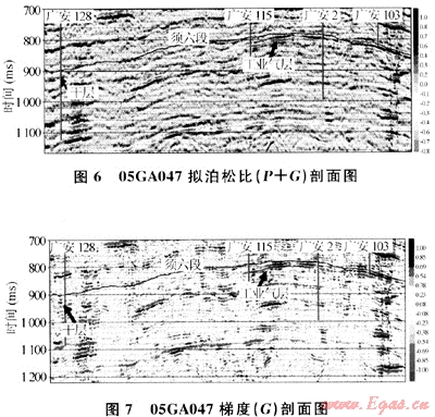 通過實(shí)際資料的AVO屬性剖面反演與鉆井結(jié)果的綜合分析對比,認(rèn)識到在上述5種AVO屬性剖面中,擬泊松比剖面(P+G)和梯度剖面(G)能很好地指示須六段儲(chǔ)層的含氣性,含氣處都表現(xiàn)為強(qiáng)振幅,且反演結(jié)果與實(shí)際鉆井結(jié)果非常吻合(見圖6、7),該方法是AVO疊前道集分析和近遠(yuǎn)道疊加剖面對比氣層預(yù)測方法的有效補(bǔ)充,可以進(jìn)一步提高須六段氣層的預(yù)測精度。