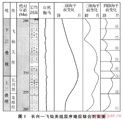 根據(jù)層序地層學(xué)的理論和方法,通過(guò)大量野外露頭、鉆井、測(cè)井與地震資料的詳細(xì)分析,認(rèn)為上二疊統(tǒng)龍?zhí)?吳家坪)-長(zhǎng)興組、下三疊統(tǒng)飛仙關(guān)組地層可作為一個(gè)二級(jí)層序,時(shí)間間隔為14Ma[4~6]。二級(jí)層序由海侵體系域和高位體系域組成,缺失低位體系域,其中長(zhǎng)興組為二級(jí)層序的海侵體系域,而飛仙關(guān)組為二級(jí)層序的高位體系域,長(zhǎng)興組與飛仙關(guān)組的分界為最大海泛面(圖1)。上二疊統(tǒng)-下三疊統(tǒng)從下至上可進(jìn)一步劃分為4個(gè)三級(jí)層序和8個(gè)四級(jí)層序(即Ⅰ、Ⅱ、Ⅲ、Ⅳ、Ⅴ、Ⅵ、Ⅶ、Ⅷ層序),其中第Ⅰ層序的底界面為I型層序界面,其余7個(gè)四級(jí)層序的底界面均為Ⅱ型層序界面。故除第1層序包括一個(gè)低位體系域、一個(gè)海侵體系域和一個(gè)高水位體系域外,其他四級(jí)層序的臺(tái)地邊緣體系域不發(fā)育,每一個(gè)層序包括一個(gè)海侵體系域和一個(gè)高水位體系域,共計(jì)17個(gè)體系域。