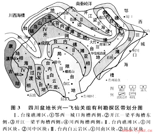 Ⅰ.臺(tái)緣礁灘區(qū):主要發(fā)育于環(huán)開江-梁平海槽、城口 鄂西海槽及川西海槽的臺(tái)緣礁灘疊合區(qū)(圖3),縱向上發(fā)育于第Ⅱ?qū)有蚋呶惑w系域、第Ⅲ層序海侵體系域的臺(tái)緣礁白云巖和第Ⅵ層序的臺(tái)緣鮞灘中,礁灘自云石化作用和溶蝕作用都較發(fā)育;主要儲(chǔ)集空間為溶蝕孔,白云石晶間孔,孔隙系統(tǒng)發(fā)育,儲(chǔ)集性能好。其中:①鄂西-城口海槽西側(cè),礁灘儲(chǔ)層發(fā)育,勘探潛力巨大,目前中國(guó)石油天然氣集團(tuán)公司已經(jīng)部署了專層井正待上鉆,成功與否,都有非常大的意義;②開江-梁平海槽東側(cè)和開江-梁平海槽西側(cè)已經(jīng)發(fā)現(xiàn)10余個(gè)礁灘氣藏,是目前四川盆地勘探的熱點(diǎn)更是重點(diǎn)地區(qū);③川西海槽兩側(cè):如若“川西海槽”找到更為充分的證據(jù)并得到證實(shí),將為四川盆地長(zhǎng)興-飛仙關(guān)組的勘探帶來(lái)一片新的天地。
