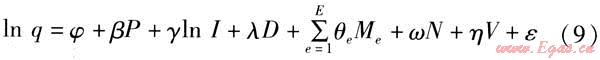 其中,P、I、D、V反映連續(xù)變量對居民生活燃氣消耗量的影響,為實際數(shù)值;Me、N是為反映定性變量對居民生活燃氣消耗量的影響而虛構(gòu)的數(shù)值,稱為虛擬變量(例如:擁有第e種燃氣設(shè)備,則Me=1,否則Me=0;用戶燃氣使用習慣為寬松型,則N=1,否則N=0)。