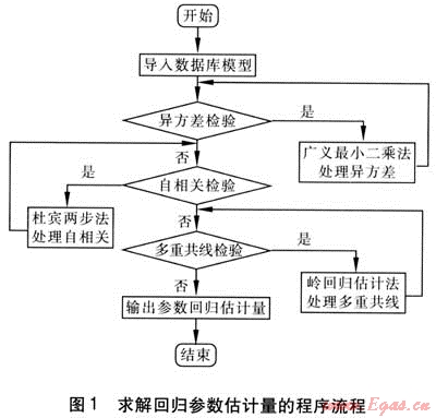 根據(jù)橫截面數(shù)據(jù)樣本,采用最小二乘法對式(9)進行參數(shù)估計,得到滿足經(jīng)典回歸假設(shè)檢驗的回歸參數(shù)。求解回歸參數(shù)估計量程序流程見圖1。