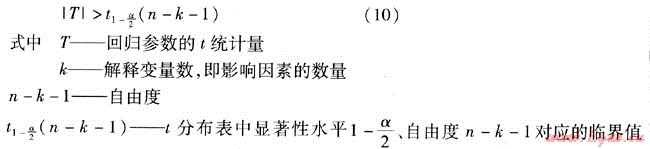 對求得的回歸參數(shù)進行t檢驗,若回歸參數(shù)的t統(tǒng)計量滿足式(10),則認為此回歸參數(shù)對應(yīng)的項目對居民生活年燃氣消耗量q有顯著影響,否則認為影響不顯著。