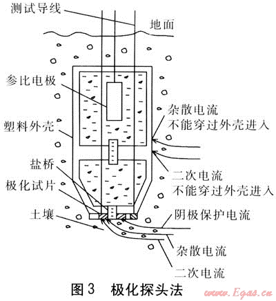 為克服上述兩種斷電法電位測量誤差大的缺陷,需要采用極化探頭法。極化探頭是把參比電極和填充介質(zhì)封閉在絕緣外殼內(nèi),被測試片與絕緣外殼適當(dāng)連接,試片外表面不被絕緣外殼包封而接觸探頭外部環(huán)境,內(nèi)表面與探頭內(nèi)部絕緣。參比電極只通過探頭底部多孔塞子滲透膜上的小孔與外界構(gòu)成測量通路,參比電極與試片盡量接近,試片用和管道相同的材質(zhì)制作。參比電極可分為液態(tài)參比電極(如Cu/飽和CuSO4、飽和甘汞)、固態(tài)參比電極(如Zn、MnO2等),根據(jù)測量對象采用不同參比電極。
