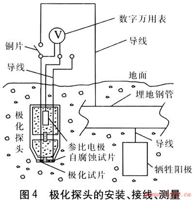 在測試點(diǎn)處埋設(shè)一個(gè)裸試片,其材質(zhì)、埋設(shè)狀態(tài)要求與管道相同,試片和管道用導(dǎo)線連接,這樣就模擬了一個(gè)覆蓋層的缺陷,由管道提供保護(hù)電流進(jìn)行極化。測量時(shí),只需斷開試片和管道的連接導(dǎo)線,就可以測得試片斷電電位,由試片電位代表管道電位,從而避免了切斷管道主保護(hù)電流Ic及其他電連接的麻煩。本方法對工程應(yīng)用較為實(shí)際,使用中應(yīng)對測試樁的功能加以補(bǔ)充,并設(shè)置埋設(shè)試片接線柱,平時(shí)與管道接線柱用銅導(dǎo)線連接并易于斷開,以供測試。應(yīng)注意試片極化時(shí)間要足夠長。