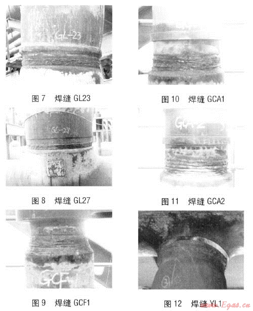 該鍋爐的設(shè)計結(jié)構(gòu)存在以下特點:部分母材管件為三通式,連接方式為焊接連接,焊縫靠近三通管件的根部,且兩焊接件之間因壁厚不同,在焊縫附近形成不同程度的凸臺。我們篩選出12道典型的焊縫,焊接管道相關(guān)參數(shù)見表1,焊縫外觀見圖1~12.其中焊縫GL1的凸臺較小。由于凸臺與焊縫距離較近,導致無損探傷(射線、超聲波探傷)不能正常進行。對于在安裝現(xiàn)場發(fā)現(xiàn)的問題,由于新建電廠鍋爐多,設(shè)備外形較大、生產(chǎn)期長,鍋爐制造單位往往難以在限定的期限內(nèi)對設(shè)備進行設(shè)計修改和現(xiàn)場改造。