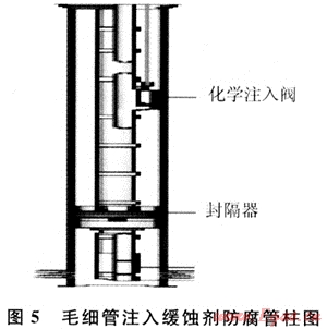 2) 對(duì)預(yù)期產(chǎn)量較低、腐蝕條件不苛刻、預(yù)期使用年限較短的井,則綜合考慮成本,采用國外常用的毛細(xì)管注入緩蝕劑(圖5)或國內(nèi)的光油管注入緩蝕劑的方式進(jìn)行防腐,地面采用泵注方法,根據(jù)現(xiàn)場監(jiān)測結(jié)果,確定緩蝕劑最佳加入濃度和加入周期等參數(shù)。