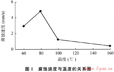 根據(jù)徐深氣田4口氣井(徐深1-1、徐深1、徐深5、徐深6井)的水質(zhì)特征,配制了實(shí)驗(yàn)溶液。通過實(shí)驗(yàn)發(fā)現(xiàn):隨著溫度的升高,CO2腐蝕速度增加,當(dāng)達(dá)到80℃時(shí),腐蝕速度達(dá)最大值;超過80℃后,可能形成的腐蝕產(chǎn)物更加致密,從而導(dǎo)致腐蝕速度逐漸減??;到160℃后,腐蝕速度更小(見圖1)。根據(jù)上述實(shí)驗(yàn)結(jié)果,制定了徐深氣田徐家圍子區(qū)塊腐蝕環(huán)境參數(shù)實(shí)驗(yàn)條件:溫度80℃,CO2分壓2.0MPa。實(shí)驗(yàn)采用了美國Cortest公司生產(chǎn)的動(dòng)態(tài)高壓釜,流速2.5m/s,經(jīng)過24h、48h和96h動(dòng)態(tài)實(shí)驗(yàn),利用失重法計(jì)算試片腐蝕速率。