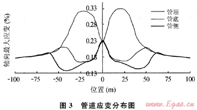 穿越該斷層的管道主要受軸向拉伸應(yīng)力作用,因而可在只控制管道軸向最大拉伸應(yīng)變情況下分析各參數(shù)對(duì)管道應(yīng)變的影響。管道軸向坐標(biāo)建立在管道穿越斷層處。在斷層作用下管道的應(yīng)變分布見(jiàn)圖3,從圖上可以看到管道最大應(yīng)變出現(xiàn)在斷層兩側(cè)30m范圍內(nèi)。