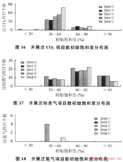 從圖16~18中可以看出,近10a來(lái)世界范圍內(nèi)實(shí)施的注氣項(xiàng)目中,采用CO2,驅(qū)及氮?dú)怛?qū)的油藏初始飽和度取值范圍為30%~60%,注烴類(lèi)氣為30%~90%。