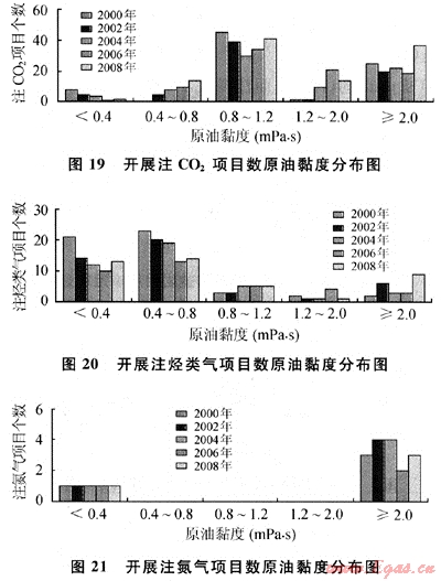 從圖19~21中可以看出:在成功進(jìn)行注CO2選擇原油黏度在0.80~1.20mPa·s范圍內(nèi)的油藏最多;在成功進(jìn)行注烴類(lèi)氣選擇原油黏度小于0.80mPa·s的油藏最多;在成功進(jìn)行注氮?dú)獾捻?xiàng)目中,選擇原油黏度范圍要么較小(小于0.4mPa·s)要么較大(大于2mPa·s)。