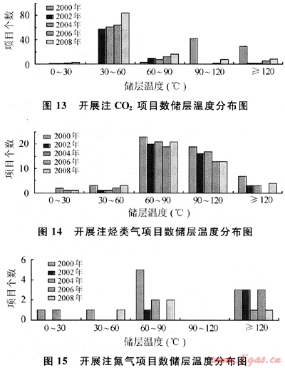 在CO2混相驅(qū)中,MMP隨油藏溫度的升高而增加[8],說(shuō)明油藏溫度過(guò)高對(duì)注CO2混相驅(qū)油藏的開(kāi)采不利。從圖13~15中可以得出,在成功進(jìn)行注CO2項(xiàng)目中,選擇溫度分布在30~60℃的油藏最多;進(jìn)行注烴類(lèi)氣的項(xiàng)目中,選擇溫度分布在60~120℃的油藏最多;注氮?dú)獾捻?xiàng)目中,選擇溫度分布在60~90℃和大于120℃的油藏最多。