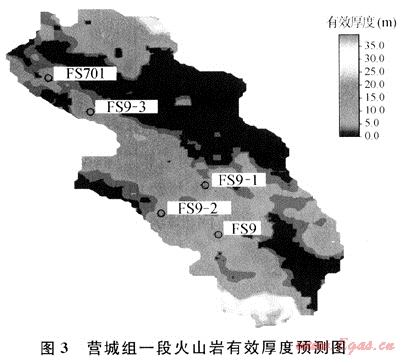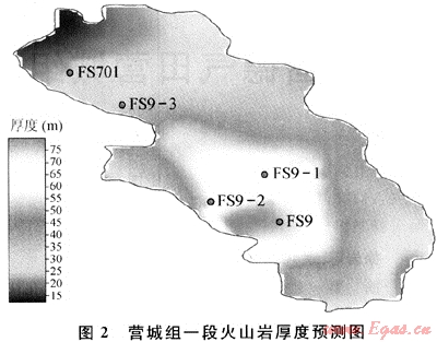 3) 屬性模型。研究區(qū)屬性建模采用測井曲線生成法,利用井筒巖石密度曲線數(shù)據(jù)建立密度模型[4]。由于火山巖與圍巖的區(qū)分十分復(fù)雜,單一屬性不能很好描述儲層分布[5],所以采用巖石密度和伽馬曲線這兩種對火山巖儲層較敏感參數(shù)進(jìn)行建模,所以本區(qū)建立了密度和伽馬模型,并根據(jù)有效厚度劃分標(biāo)準(zhǔn),預(yù)測了營城組一段有效厚度分布。本次建模過程中將密度曲線粗化后,進(jìn)行變差函數(shù)分析,正確的變異函數(shù)估計要求對采樣方式、均值變化或樣品承載大小以及變異函數(shù)對方位變化的敏感性作出全面的評價。然后用密度反演體作為協(xié)變量,進(jìn)行10次隨機(jī)實現(xiàn)[6~7]。圖2為通過昌德氣田的密度屬性模型得出的營一段儲層厚度預(yù)測圖,F(xiàn)S9區(qū)塊發(fā)育一個經(jīng)過FS701、FS9-1、FS9井的北西向火山巖條帶。