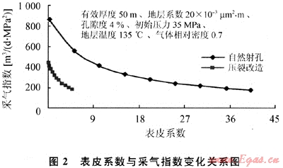 從模擬看(圖2),壓裂井表皮系數(shù)在0.3時,采氣指數(shù)與零表皮對比下降幅度在10%左右,由于壓裂井表皮系數(shù)普遍較低,因此表皮系數(shù)對壓裂井產(chǎn)能影響較小。射孔完井的井表皮系數(shù)一般較高,因此表皮系數(shù)對產(chǎn)能的影響較大,如果表皮系數(shù)達(dá)到20,則采氣指數(shù)與表皮系數(shù)為0時的對比下降幅度達(dá)到68%。有些射孔完井的井在試采中產(chǎn)量與壓力保持穩(wěn)定,關(guān)井后壓力恢復(fù)程度高,恢復(fù)速度快,但采氣指數(shù)并不高,與表皮系數(shù)的影響有很大關(guān)系。