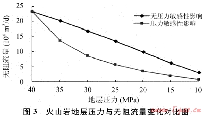 巖心實驗表明,火山巖儲層具有很強(qiáng)的壓力敏感性。以實驗數(shù)據(jù)為基礎(chǔ)數(shù)據(jù),假定儲層有效厚度50m,流動半徑700m,未考慮壓裂改造影響,采用擬穩(wěn)態(tài)氣井產(chǎn)能公式,分別計算了無壓敏影響和有壓敏影響下的氣井產(chǎn)能變化情況,從計算結(jié)果看(圖3),在考慮壓敏影響下隨著地層壓力的下降,氣井產(chǎn)能與無壓敏影響下的產(chǎn)能有較大的差距,最高損失達(dá)到70%。