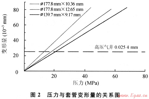 根據(jù)式(5)可計算套管的變形值。計算出的變形值是套管膨脹變形值,而在水泥凝固后釋放內(nèi)壓,套管收縮回原尺寸,此膨脹變形就變?yōu)樘坠芘c水泥膠結(jié)被破壞而形成微環(huán)隙。從式(5)可知:①套管尺寸越大,相同壓差下,產(chǎn)生的微環(huán)隙越大;②套管尺寸相同,壁厚越薄,產(chǎn)生的微環(huán)隙愈大;③對于固定套管而言,微環(huán)隙大小與受的壓差成正比。通過施加外擠壓力使套管具備彈性能,在水泥漿候凝發(fā)生徑向體積收縮時,通過釋放彈性能,彌補體積收縮產(chǎn)生的微環(huán)隙,消除氣竄通道,從而提高固井質(zhì)量。