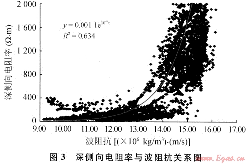 由圖3看出,區(qū)塊波阻抗與電阻率呈乘冪關(guān)系,波阻抗高值對(duì)應(yīng)電阻率高值,統(tǒng)計(jì)結(jié)果與地質(zhì)認(rèn)識(shí)吻合,擬合的關(guān)系式相關(guān)系數(shù)較高,可以滿足反演處理的要求。區(qū)塊波阻抗與RTC的統(tǒng)計(jì)關(guān)系不是很明顯,所以采用間接方式得到波阻抗與RTC的轉(zhuǎn)換關(guān)系。結(jié)果表明RTC反演與地質(zhì)情況吻合,擬合的相對(duì)關(guān)系式相關(guān)系數(shù)較好,完全能滿足反演處理的要求。