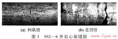 本次研究對(duì)研究區(qū)內(nèi)8口取心井目的層的裂縫發(fā)育狀況進(jìn)行了巖心觀察和描述。從研究區(qū)裂縫發(fā)育情況看,研究區(qū)天然裂縫發(fā)育,主要為構(gòu)造縫(張裂縫、網(wǎng)狀縫),其次為成巖縫(圖1)。
