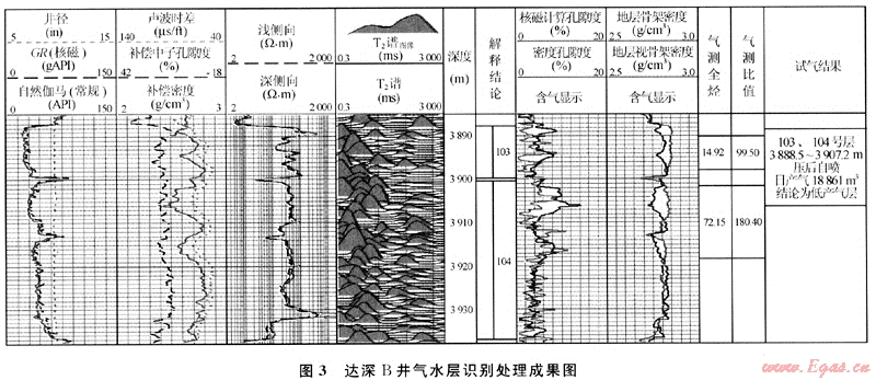 圖3是達深B井流體識別處理成果圖,巖性為玄武巖。從圖中可以看到,試氣層段應(yīng)用核磁共振判別法的密度孔隙度與核磁計算孔隙度有明顯幅度差,應(yīng)用雙密度重疊法也見明顯含氣反映,且錄井氣測比值較大,綜合分析判別該層為氣層。實際試氣結(jié)果表明,3888.0~3907.0m井段壓后日產(chǎn)氣18851m3,與測井識別結(jié)果一致。