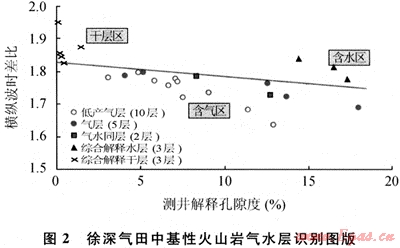 理論上當?shù)貙雍瑲鈺r,由于天然氣比液體更容易壓縮,因此含氣巖石的縱波速度一般比含液體巖石的速度低,即縱波時差(△Tc)在氣層處變大;而橫波時差(△Ts)卻變化極小。同時由于地層巖性、物性的變化同樣也可能引起速度的改變,因此單純應(yīng)用縱波時差去識別天然氣,存在著一定的風(fēng)險性,但如果通過比較橫波和縱波的速度差異來判別氣層,則要可靠得多。故可據(jù)此來進行流體識別。