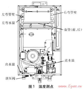 圖1為溫度測(cè)點(diǎn),此外,還有室外溫度和熱水器周圍溫度(廚房、冷陽臺(tái)),其中左彎水溫、進(jìn)水溫、出水溫采用在水管上鉆孔將溫度探頭伸進(jìn)管中測(cè)水溫形式,其余各點(diǎn)則測(cè)水管外壁。