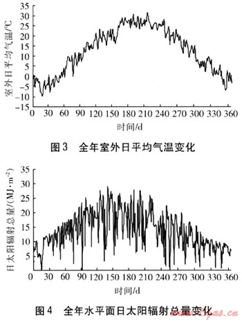 在模擬分析中,采用中國(guó)氣象局氣象信息中心提供的建筑熱環(huán)境氣象數(shù)據(jù)集中北京地區(qū)典型年的氣象數(shù)據(jù)[12]。全年室外日平均氣溫及水平面日太陽(yáng)輻射總量見(jiàn)圖3、4。由圖3、4可知,在非供暖期,室外溫度較高,太陽(yáng)輻射較強(qiáng),可以把這部分太陽(yáng)能儲(chǔ)存到地下坑槽中,供暖期再用熱泵提取,進(jìn)行供暖。在供暖期,太陽(yáng)輻射與建筑熱負(fù)荷在時(shí)間上不同步,供暖初期和末期,太陽(yáng)輻射較強(qiáng),室外平均溫度較高,熱負(fù)荷較??;供暖中期,室外平均溫度較低,熱負(fù)荷較大,太陽(yáng)輻射較弱。因此,在供暖初期和末期,優(yōu)先利用集熱器收集的太陽(yáng)能供暖,減少熱泵的耗電量,提高系統(tǒng)的性能。
