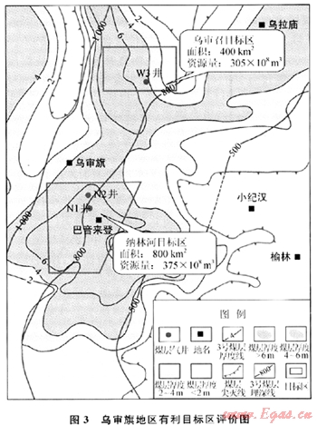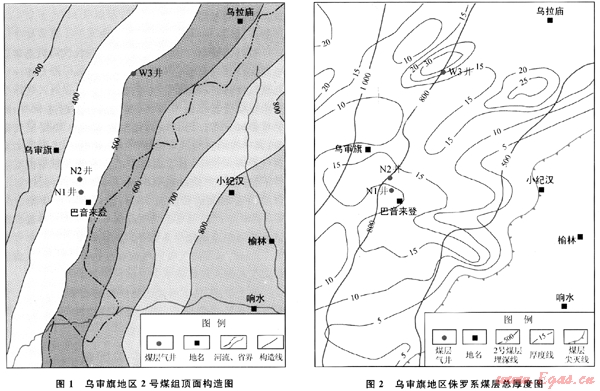 烏審旗地區(qū)煤炭資源豐富,煤層氣勘探潛力巨大。近年來,研究人員通過分析研究天然氣鉆井、煤炭鉆孔及煤巖分析資料以及地震測線解釋,發(fā)現(xiàn)該區(qū)煤層厚度大、分布廣,具有良好的煤層氣成藏條件。目前該區(qū)已鉆煤層氣井15口,煤層含氣性變化較大,因此,進一