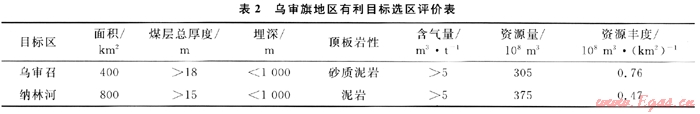 根據(jù)上述分析,按照煤層總厚度大于10m,埋深在1000m以淺,煤層頂板為泥巖、砂質(zhì)泥巖,煤層含氣量大于5m3/t等選區(qū)評價標準,綜合分析各個區(qū)塊的煤層氣地質(zhì)條件,結(jié)論認為:北部烏審召區(qū)塊和南部納林河區(qū)塊是煤層氣有利勘探目標區(qū),2個區(qū)塊含煤總面積為1200km2,煤層氣資源量達680×108m3(圖3、表2)。