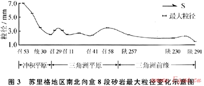 蘇里格地區(qū)主體處于三角洲平原、三角洲前緣沉積相帶。 中二疊世石盒子期盒8時,北部物源區(qū)進(jìn)一步隆升[7],為盆地沉積提供了豐富的碎屑物質(zhì),古氣候由潮濕轉(zhuǎn)為半干旱干旱,受氣候季節(jié)性、周期性變化影響,湖平面頻繁波動,在平坦地形的情況下,湖岸線擺動大而且迅速,三角洲平原上的分流河道通過湖面的頻繁波動向湖泊中心方向長距離推進(jìn),形成高建設(shè)型河流三角洲沉積,且導(dǎo)致不同期次的河道橫向反復(fù)遷移,砂體縱向上多期疊置,平面上連片分布,主力氣層盒8段形成延伸范圍達(dá)數(shù)百千米大面積分布的砂巖儲集體。砂巖粒度總體表現(xiàn)為北粗南細(xì)、以中-粗粒為主的特征,北部沖積平原相砂巖最大粒徑達(dá)7.0mm,向南延伸的三角洲前緣相仍發(fā)育粗粒相砂巖,砂巖的最大粒徑達(dá)2.0mm(圖3)。