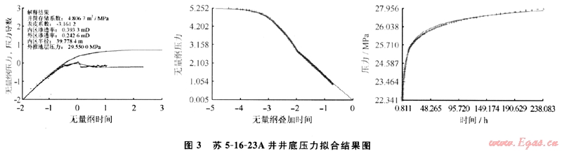 最終得到了該井表皮系數(shù)為-3.16,說(shuō)明是壓裂后受效井,表皮系數(shù)較小;分析該井地層模型為復(fù)合地層,內(nèi)區(qū)滲透率為0.39mD,內(nèi)區(qū)半徑為39.7m,說(shuō)明近井地帶40m左右是壓裂后滲透性改善區(qū);而外區(qū)滲透率0.2426mD,說(shuō)明壓裂縫外圍地層的滲透情況。