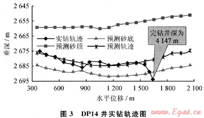 DP22井在水平段的氮氣泡沫欠平衡鉆進過程當(dāng)中實現(xiàn)了隨鉆點火,火焰高4~6m,后效火焰高9~11m,油氣顯示非常活躍。DP22井在井深3727~3906m井段伽馬值偏高,判斷為鉆遇泥巖夾層,后退至3470m處進行懸空下切側(cè)鉆,后鉆至井深4442m處完鉆,由于后退下切側(cè)鉆導(dǎo)致氮氣泡沫實鉆進尺超過1900m。在最后一趟鉆起鉆過程中出現(xiàn)了卡鉆事故。事故原因為沉沙卡鉆,最后一趟鉆總進尺為281.54m,平均機械鉆速為11.04m/h,在鉆井過程中伽馬值偏高,同時出口處沒有巖屑返出。圖7給出了DP22井氮氣泡沫欠平衡水平段實鉆軌跡。