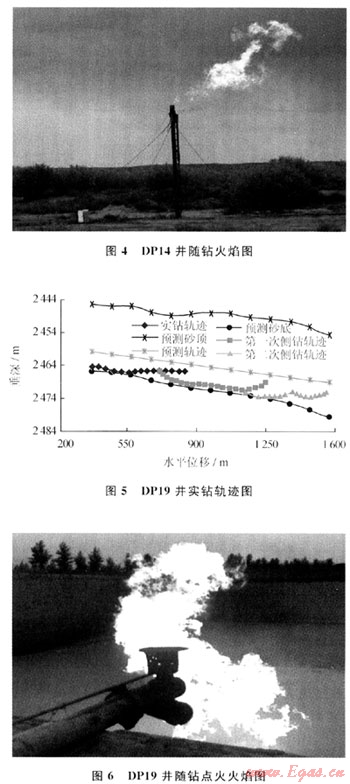 DP19井采用氮氣泡沫欠平衡鉆水平井技術(shù),實現(xiàn)了隨鉆點火,火焰高達(dá)3~5m。在欠平衡水平段的鉆井過程中由于兩次鉆遇大段泥巖,進行了兩次后退懸空下切側(cè)鉆繞泥,導(dǎo)致氮氣泡沫欠平衡實鉆進尺超過1500m,在整個欠平衡水平段鉆井過程中沒有出現(xiàn)井壁失穩(wěn)。圖5給出了DP19井氮氣泡沫欠平衡水平段實鉆軌跡,圖6給出了DP19井隨鉆點火情況。