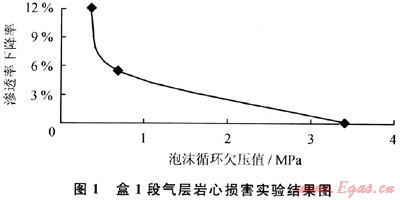 圖1給出了盒1段氣層巖心損害實驗結(jié)果,從圖1中可以確定出盒1段氣層欠平衡水平井的最佳欠壓值為3.4MPa,即在盒1段氣層實施欠平衡水平井的循環(huán)介質(zhì)當(dāng)量循環(huán)密度需小于0.76g/cm3,滿足該條件的循環(huán)介質(zhì)只有氮氣和氮氣泡沫,但考慮到鉆井時產(chǎn)生的振動影響、電磁隨鉆測量系統(tǒng)的可靠性要求以及鉆頭的冷卻問題,決定選用可循環(huán)氮氣泡沫作為循環(huán)介質(zhì),其當(dāng)量循環(huán)密度為0.2~0.5g/cm3,滿足了施工要求。