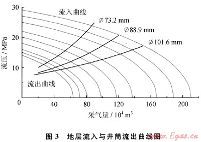 單井采注氣能力的大小,受地層滲流能力和井筒流動(dòng)能力兩方面因素影響,只有當(dāng)?shù)貙恿魅肽芰εc井筒流出能力協(xié)調(diào)一致時(shí),也即在流入流出曲線圖(圖3)中曲線交匯處氣井的生產(chǎn)能力才是最高的。