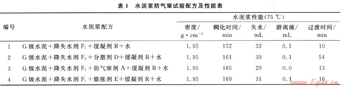 使用作者所述的水泥漿防氣竄性能評價方法,對國內(nèi)一些氣田的尾管固井水泥漿配方進行了研究。研究表明,現(xiàn)場固井效果和室內(nèi)結(jié)果有很好的一致性。下面給出一些代表性的實例: