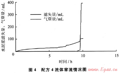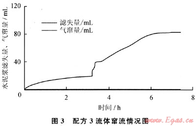 圖3所示為配方3水泥漿氣竄試驗的流體竄流情況。從圖3中可知,向含有降失水劑F1的水泥漿中摻入一定量的膠乳類防氣竄劑A后,由于該類防氣竄劑可以通過在水泥漿內(nèi)部擠壓成膜等作用來限制氣體在水泥漿中的運移,提高了該水泥漿在候凝期間的內(nèi)部結(jié)構(gòu)阻力,因而極大地提高了該水泥漿的防氣竄能力。