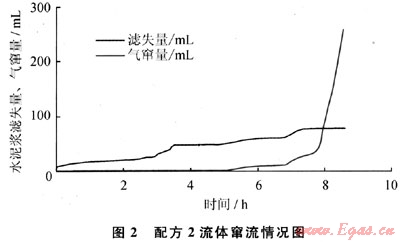 圖2所示為配方2水泥漿氣竄試驗的流體竄流情況。降失水劑F2通過在氣液界面成膜來控制失水,從圖2可以得知,對于該水泥漿配方,雖然降失水劑F2通過在水泥漿與地層交界處形成一種耐壓膜,一定程度上限制了氣體對水泥漿的侵入,但是由于在試驗溫度下該降失水劑成膜的穩(wěn)定性不佳,不能有效降低候凝期間該水泥漿配方的滲透率。因此,后期氣體還是能不斷置換水泥漿內(nèi)流體,最后發(fā)生了竄流。