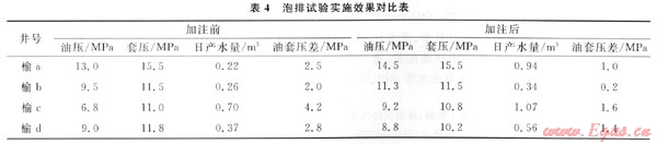在生產(chǎn)過程中,常出現(xiàn)油套壓差增大的情況,說明井底或井筒中有積液,如果氣井井底或井筒積液嚴(yán)重,對氣井的生產(chǎn)會帶來很大的影響。由于低產(chǎn)井的產(chǎn)能普遍比較低,部分井的產(chǎn)量不能滿足攜液要求,如果積液不及時帶出,將嚴(yán)重影響氣井連續(xù)穩(wěn)定生產(chǎn)。為了更好地發(fā)揮氣井產(chǎn)能,結(jié)合泡沫排水采氣工藝,針對油套壓差相對較大、井底或井筒中有積液的氣井,間歇性加入起泡劑,排除凝析水,延長開井周期。目前在榆林南區(qū)正大面積推廣[2~3](表4)。